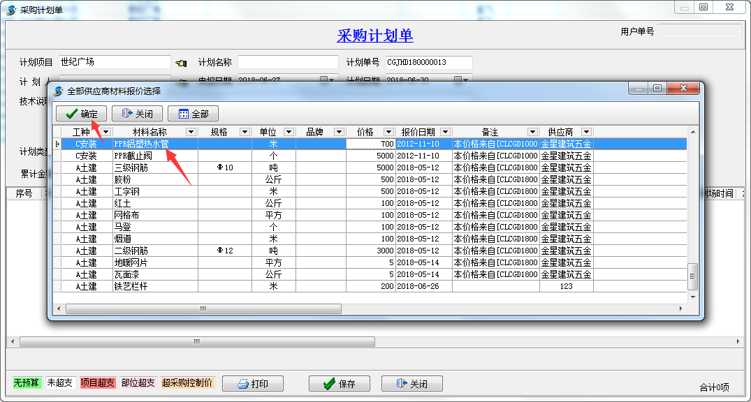 进入材料预算单,添加好材料后,点击计算采购价,软件会把相对应材料的最低报价、最低采购价和最近采购价自动计算出来,如上图